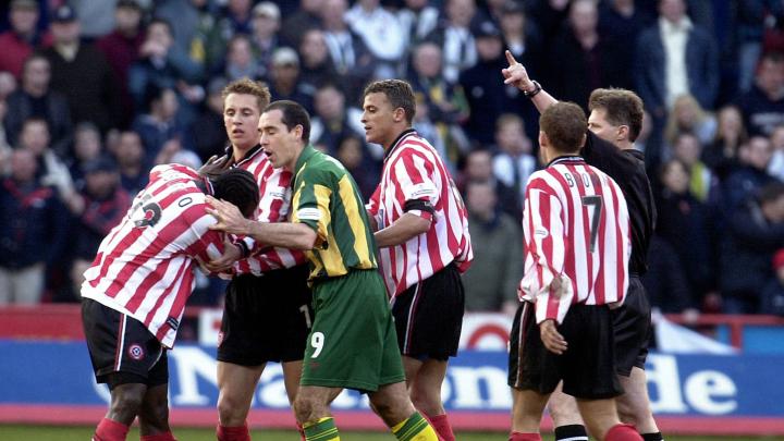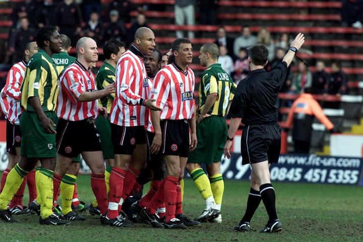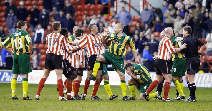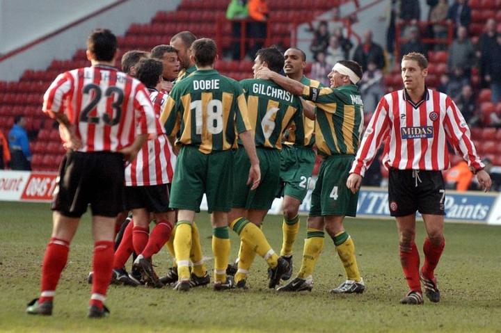 看了上面的这些描述,相信你一定会觉得这是一场关乎二队生死的保级、升级关键战,然而在2001/02赛季,还剩8场联赛比赛的情况下,西布朗以67分名列第三,落后竞争对手狼队11分。与此同时,谢菲尔德联在积分榜上以50分,排名第15位,没有降级的风险,但很明显也没有威胁到对手季后赛的位置。但是就是这样一场平淡无奇、普普通通的比赛,却改写了历史,那天整个球场都在弥漫着暴力、血腥的气氛中进行,我们也就此见证了一次次的大规模冲突,和教练席、替补席间的激烈争吵。