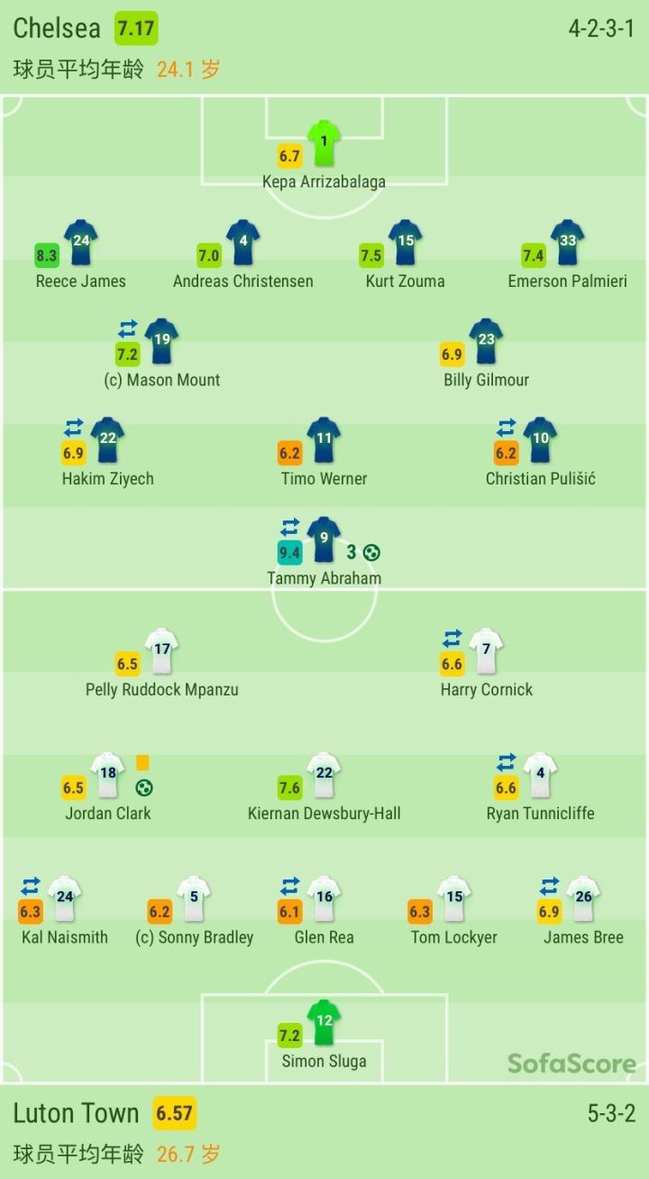 切尔西首发:1-凯帕,24-里斯-詹姆斯,15-祖马,4-克里斯滕森,33-埃莫森,19-芒特(84'17-科瓦契奇),23-吉尔摩,22-齐耶赫(77'29-哈弗茨),11-维尔纳,10-普利西奇(70'20-奥多伊),9-亚伯拉罕(77'18-吉鲁)