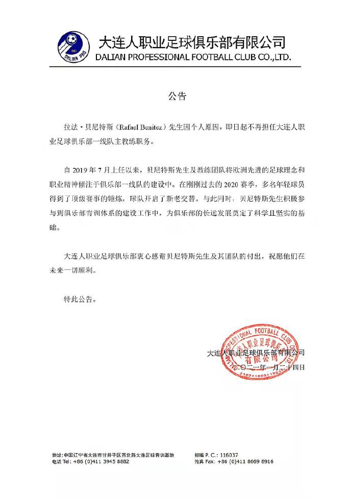 是的,贝尼特斯没有返回中国,他不想要回到这个封闭的足球环境,他提出了辞职。