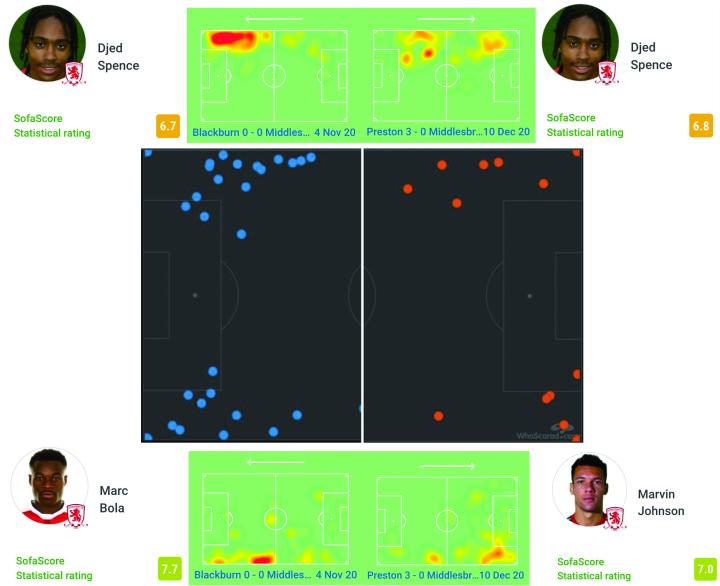 当然,米德尔斯堡最近的打法发生了两大变化,这帮助了这种新的进攻战术更好适应这种简单的进攻方式。米德尔斯堡在布莱克本的0-0战平后调整了战术安排,由4-3-3的防守组合转化为了更加注重边前卫、翼卫和中场渗透的4-4-2阵型。从三位边路球员在比赛中的热区活动图的比较我们可以看出,在两场不同的比赛当中,对阵米尔沃尔比赛中球队的边路核心的热区图更加的松散,更多的集中在20码的位置以内,突出反应了沃诺克的战术基础:
