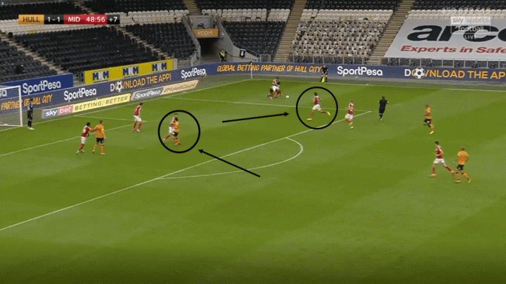 米德尔斯堡在比分领先之后很快就又中路的短传渗透进而转为长传冲吊战术,加大了对对手的后场逼抢力度,迫使对手向前场大脚解围,迫使对手长传,交出求权。