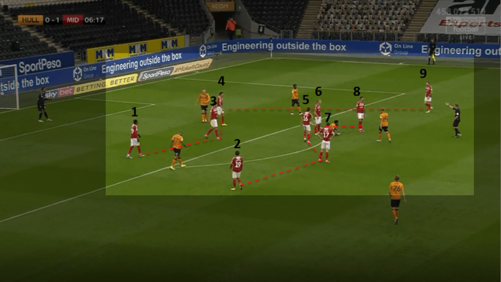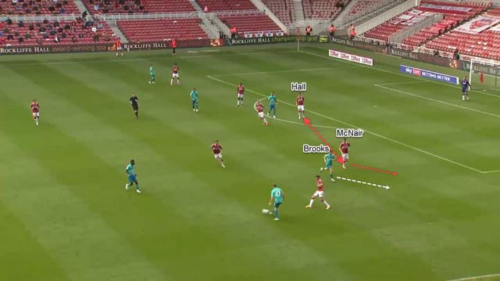 沃特莫尔对阵米尔沃尔的第一次比赛出场的进球和阿克篷对阵卢顿的决胜球在进球前的战术打法几乎是完全对称的。沃诺克依靠中路组织核心在接到皮球后快速分边,给到马文·约翰逊的跑动路径,而米德尔斯堡中锋随机跑位接应来自中路的传中球,取得进球。