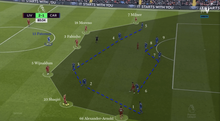 在前80分钟的比赛中,沃诺克的高位逼抢防守战术也对利物浦在进攻线上,球员的较换位置的各种轮换也造成了影响,尤其是在中场球员的配合和换位上。卡迪夫中场在球场中央贴身盯防目标球员,接到传球的萨拉赫和罗伯托·菲米诺就会在中路深陷,形成二打四的艰难局面。