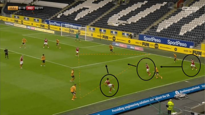 米德尔斯堡多数的进攻都来自右路的三组合配合,罗伯茨和斯彭斯结合另外一名边后卫在禁区外的狭小空档中赢得传球路线,制造低平球传中或者点球机会。
