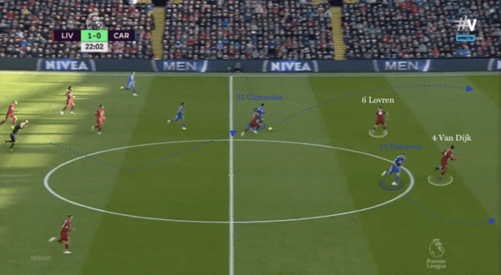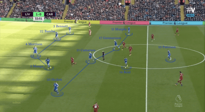卡迪夫对利物浦4-3-3的状态做出了反应,在利物浦控球后,两名前锋博比·里德和帕特森的快速逼抢体系对利物浦的后场传导造成了一定的威胁,来阻止利物浦在中场的传递。反压和保持较高比赛节奏的中场很快帮助球队重新夺回了控球权。