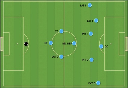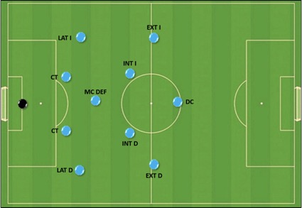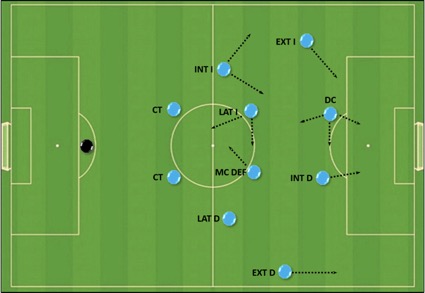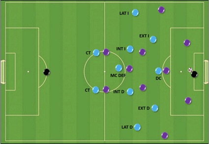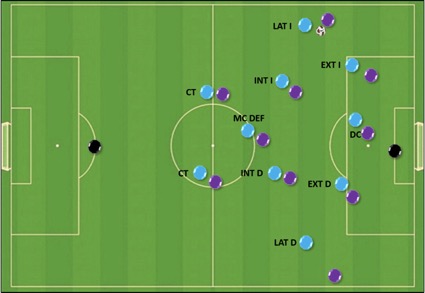 同时,弱侧边后卫同样内收至中路位置,与两名中后卫形成“三后卫”的相对位置关系,同时与身前的边后卫和后腰球员形成中路的“五边形”站位。进攻层面上保证了对于中场空间位置的占据,形成大量出球线路,同时与内收的两名中前卫球员形成纵深的三角位置关系与出球线路; 防守层面上由于两名边后卫没有采用传统的套边战术,事实上后防线4名球员与后腰的位置保证了阵型的整体防守比重并未被削弱。