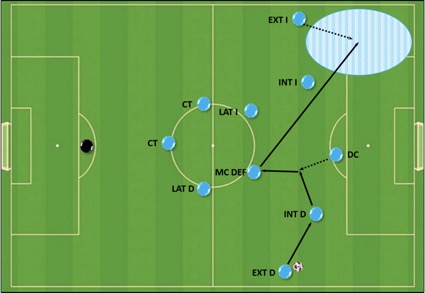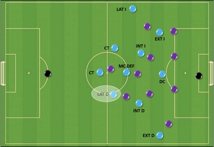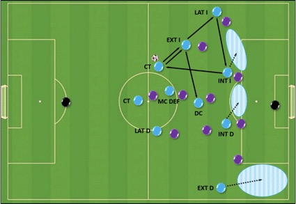 上图可见,当右边锋(EXT D)位置使用顺足(右脚)球员,左边锋(EXT I)使用逆足(右脚)球员,且左边后卫(LAT I)使用进攻属性更强的顺足(左脚)球员时。瓜迪奥拉限制一侧边后卫插上进攻的比重,右边后卫内收至中场位置与两名中后卫以及后腰球员形成中场中路的菱形站位,整体阵型的进攻重心向左侧边路倾斜,右边锋拉边保持进攻阵型整体对于场地宽度的利用,左边锋内收至对方肋部空间同时保持与插上的左边后卫在边路的人数优势与呼应,两名中前卫场上位置整体前压,与后腰以及中锋形成两个三角位置关系,保持中路足够的出球线路,看似中前场的5名参与进攻的球员横向一字排开,并没有很好的利用场地的纵深空间,关于这一问题,我们在下面会有进一步的讲解。