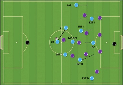 上图可见,左边后卫向前撕扯牵制对方盯防的右边后卫,左边锋向后撕扯带走盯防的对方边前卫球员,形成边前卫身后,边后卫与中后卫之间的空间,中锋向后撕扯带走盯防的中后卫或后腰球员形成其身后的两名中后卫之间的空间,分别由两名中前卫完成后插上进攻。