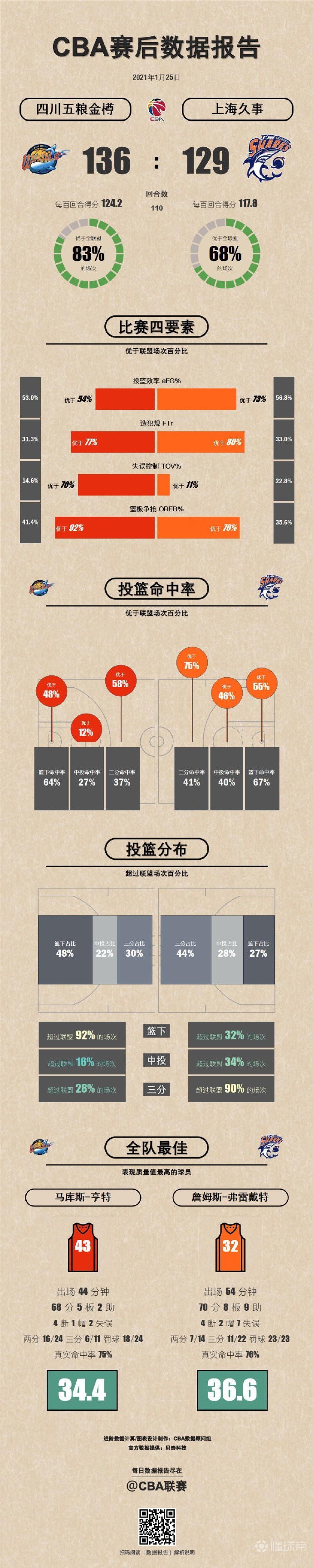 CBA战报北京时间1月25日12:30,CBA常规赛再战一场,四川对阵上海的比赛开战。本场比赛两队外援亨特和弗雷戴特上演飚分大赛,弗雷戴特投进常规时间绝平三分,共砍下70分;亨特命中第一个加时的平局三分,共砍下68分,最终历经两个加时,四川136-129击败上海。