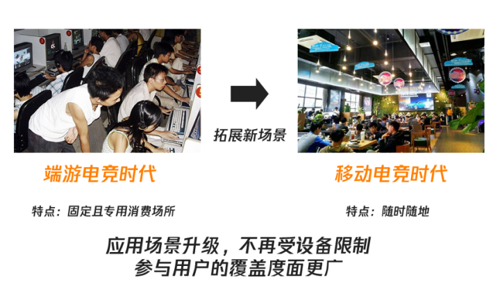 传统的端游电竞受制于硬件与网络等物理条件,电竞相关消费大多集中在网吧等固定场所。