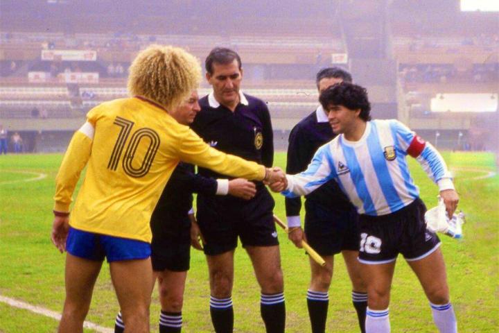 (图)1987年美洲杯,巴尔德拉马与马拉多纳赛前握手