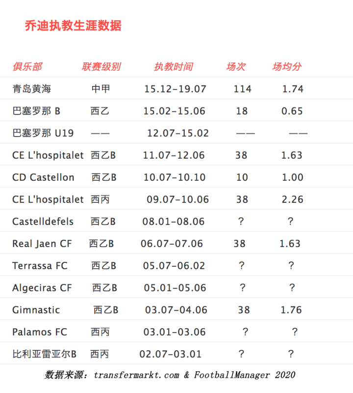 乔迪在执教生涯的前10年,唯一一份拿得出手的执教成绩单 - 是带领CE L'Hospitalet这家俱乐部征战西乙B联赛,在整整一年时间里,48场联赛拿到了1.65的场均分。