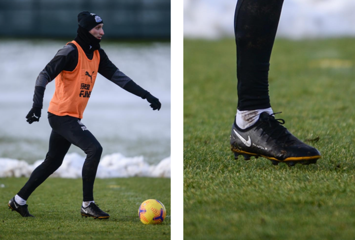 纽卡斯尔中场谢尔维穿着去年 "Tech Craft "套装中的Phantom GT。这个设计向1994年世界杯上的Nike Tiempo原版造型致敬,皮革鞋面与橙色大底相得益彰