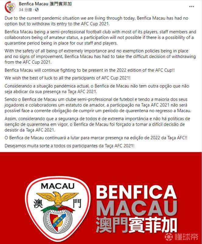 官方:澳门本菲卡退出2021年亚足联杯