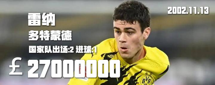 目前最受瞩目的球二代之一,前美国老将雷纳德的儿子,同时他也又葡萄牙血统。在多特这个赛季,他出场了26次,其中18场首发,打进4球助攻5次。可以说数据是很华丽了。而在多特目前的球队里,拥有他和穆科科,哈兰德这样的年轻人可以说是非常羡慕!