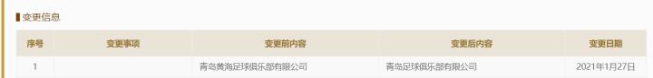 据国家企业信息公示系统显示,青岛黄海足球俱乐部已经正式变更为青岛足球俱乐部。
