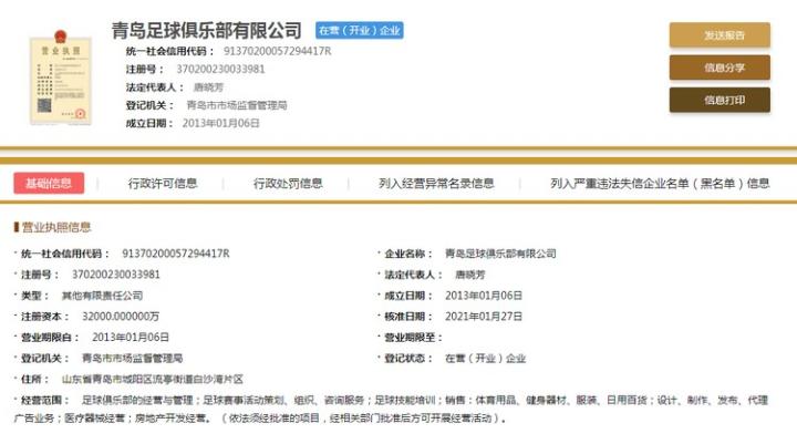 据网站信息显示,青岛足球俱乐部是在1月27日完成的更名工作,此前曾用名为青岛黄海和青岛海牛。