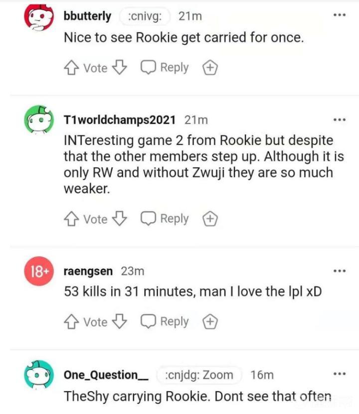 -Rookie在第二场比赛中表现得很乐观。谢天谢地Theshy决定了每两周来Carry一次,还有就是LPL真的是全世界最好看的联赛,尽管两支队伍的实力并不接近。