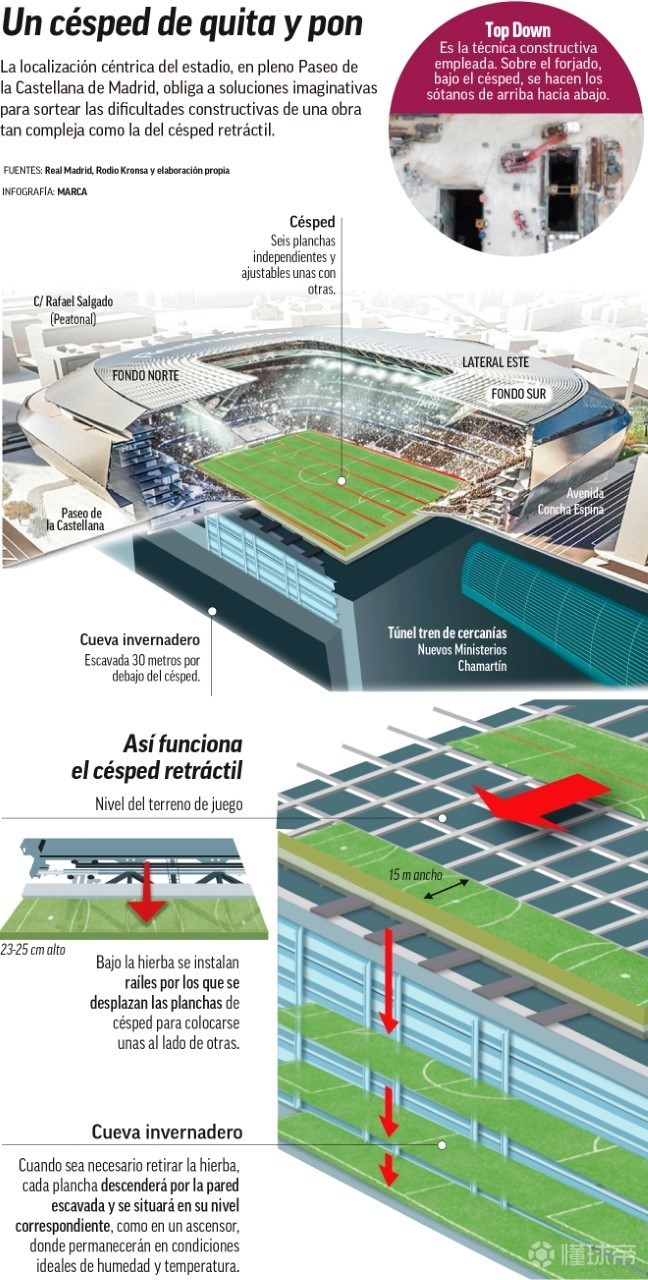 《马卡报》披露了伯纳乌改建工程的最新进展,目前可伸缩草皮已在安装中,草皮四周可看到已开挖的30米长洞穴,用于存放底板。