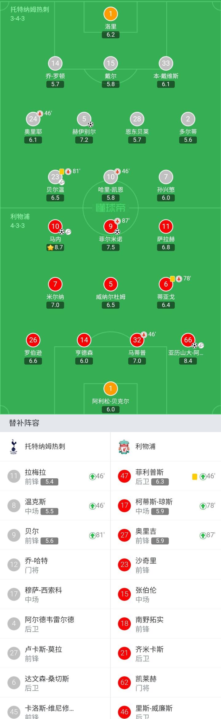 热刺首发:1-洛里、24-奥里耶(46'8-温克斯)、14-乔-罗顿、15-戴尔、33-本-戴维斯、2-多尔蒂、5-赫伊别尔、28-恩东贝莱、23-贝尔温(80'9-贝尔)、7-孙兴慜、10-凯恩(46'11-拉梅拉)