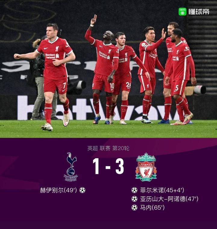 北京时间1月29日04:00,英超第20轮,热刺主场迎战利物浦。上半场孙兴慜进球被吹越位在先,马内错失良机,菲尔米诺半场补时破门。下半场阿诺德、马内建功,赫伊别尔扳回一球,萨拉赫进球无效。最终,利物浦3-1热刺。