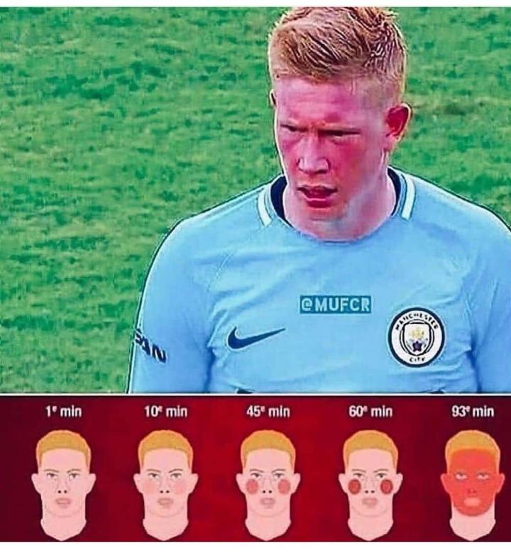 【绿茵场丁丁历险记90分钟面部变化】 德布劳内因为长相和表情与比利时国宝级动漫《丁丁历险记》主人公比较像而得名此外号 如今他已经是足坛最好的喂饼大师 本赛季他打进3球助攻15次 而大家也会发现丁丁的脸在比赛中随着时间和激烈程度会逐渐变红,而且不知道是不是太白白净净的缘故显得特别明显 于是就有了下面这组他90分钟的脸部变化别,挺有道理的!