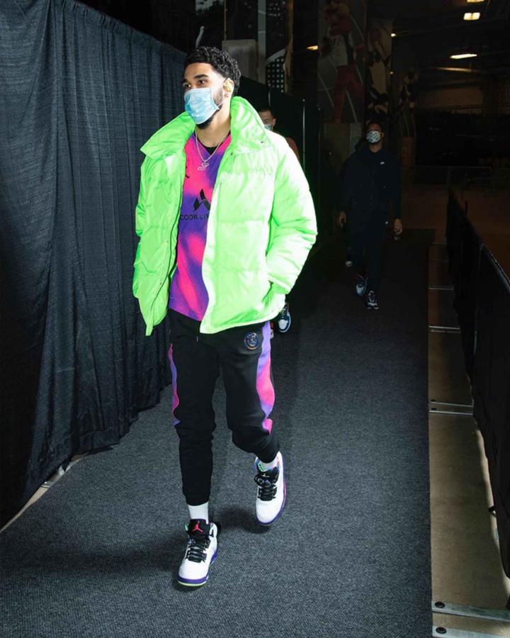 杰森·塔图姆穿着的这件全新联名球衣采用了与那双PSG × Air Jordan 1 High Zoom CMFT篮球鞋鞋口位置相同的粉红色与紫色图案。此外,他穿着的那条运动裤也采用了相同的印花。不过在球鞋上,他穿着的并不是已经曝光的AJ1,而是一双拥有同样设计的Air Jordan 5。