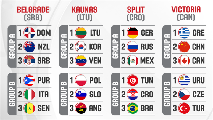 12支球队根据世界排名分为四档,其中四个落选赛球队根据落选赛该赛区世界排名最高的球队确认分档(贝尔格莱德赛区塞尔维亚(5),考纳斯赛区立陶宛(8)),斯普利特赛区俄罗斯(9),维多利亚赛区希腊(7)),分档情况如下: