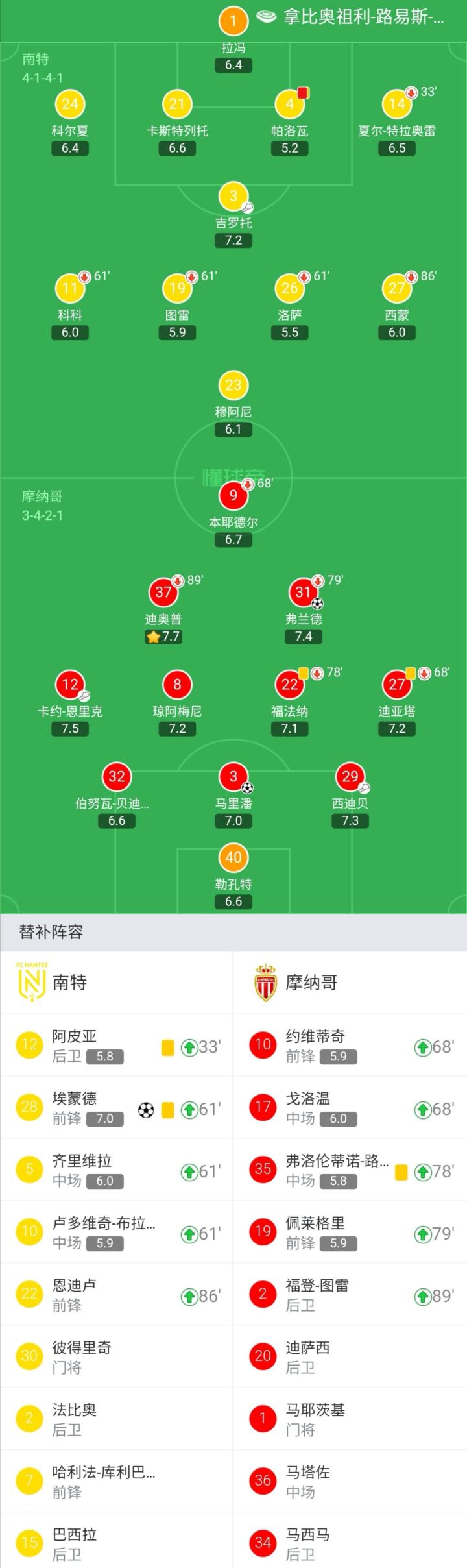 南特首发:1-拉冯、24-科尔夏、21-卡斯特列托、4-帕洛瓦、14-夏尔-特拉奥雷(33`12-阿皮亚)、3-吉罗托、19-图雷(61`10-卢多维奇-布拉斯)、26-洛萨(61`5-齐里维拉)、11-科科(61`28-埃蒙德)、27-西蒙(86`22-恩迪卢)、23-穆阿尼