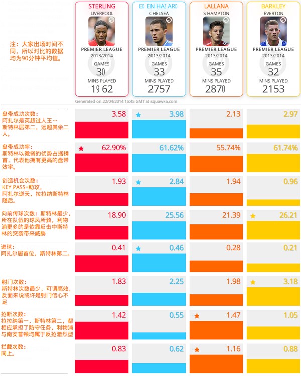 数据来源于Squawka Comparison的球员对比分析图。大家出场时间不同,所以对比的数据均为90分钟的平均值。