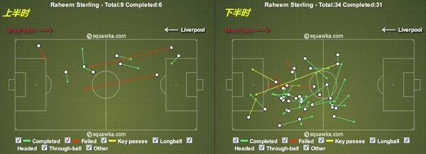 面对西汉姆的密集防守,司职右翼的斯特林在上半时尝尽苦头,铁锤帮低位的双层防线几乎没有任何空间能让斯特林进行冲刺,铁锤的贴身防守让他疲于奔命并失且误频频,中场休息罗杰斯将斯特林从右翼位置后撤至AMC,将4-3-3调整为菱形4-4-2,斯特林并没有辜负教练的期望,下班时交出一份令人满意的答卷。