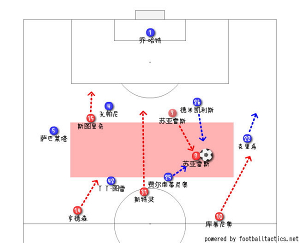 如果苏亚雷斯拉边,斯图里奇惯性的在中路出现,则斯特林会作为宽度拉扯的飞翼,打开肋部空间。