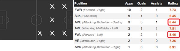 他最佳位置为前腰AMC,左边前卫FWL,右边前卫FWR,上图中Whoscored大多数时候会根据首发来统计斯特林的出场位置,但是罗杰斯几乎都会把他往回拉到AMC的位置作为菱形4-4-2的中前场尖刀,本赛季他的高光场次几乎都打这个位置,后面会细说这点。