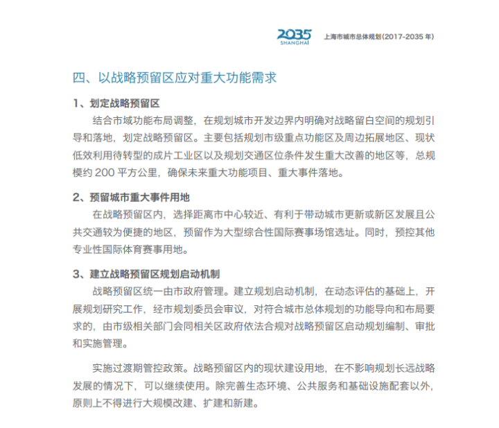 2018年11月,上海市体育局发布招标公告,内容和上海市申办2032夏季奥运会的可行性研究有关,引发外界热议。虽然上海市体育局很快发表声明称只是“构建赛事体系的基础性研究”,并无申办奥运会的意向,但所谓无风不起浪,若真没有意向恐怕也不会花费60余万元的代价专程进行研究。无独有偶,同年1月上海市曾发布一份《上海市城市总体规划(2017-2035年)》,其中“战略预留区”部分提到,将在靠近市中心且交通便利的区域预留一定面积的场地,作为“大型综合性国际赛事场馆”的选址。另外,文件还要求预留地能带动新区发展以及城市更新。