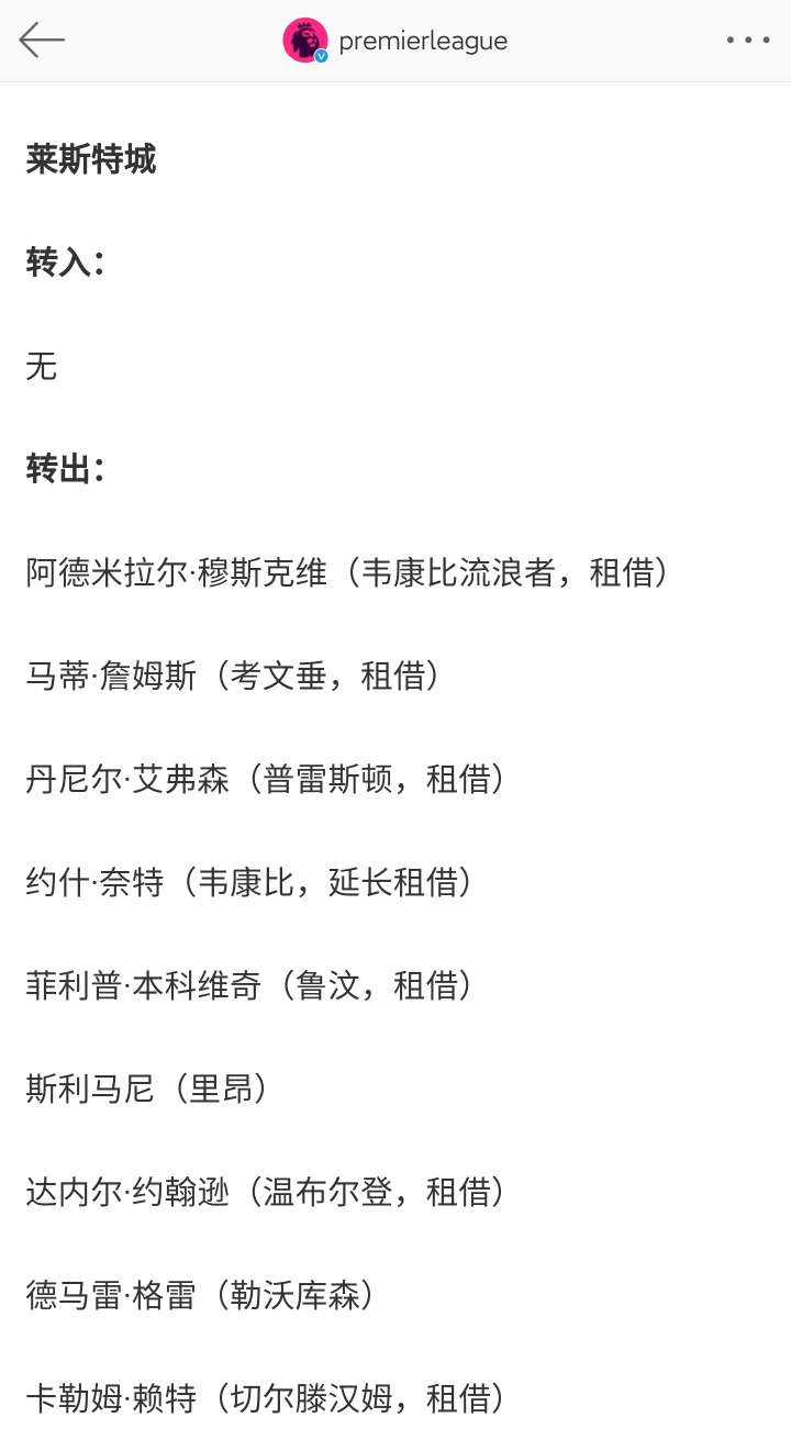 英超联赛官博整理了各支球队的冬窗转会。莱斯特城转...