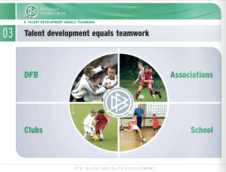 德国青训系统由德国足协(DFB)、足球协会、足球俱乐部、学校四方构成,搭建多个联合平台。