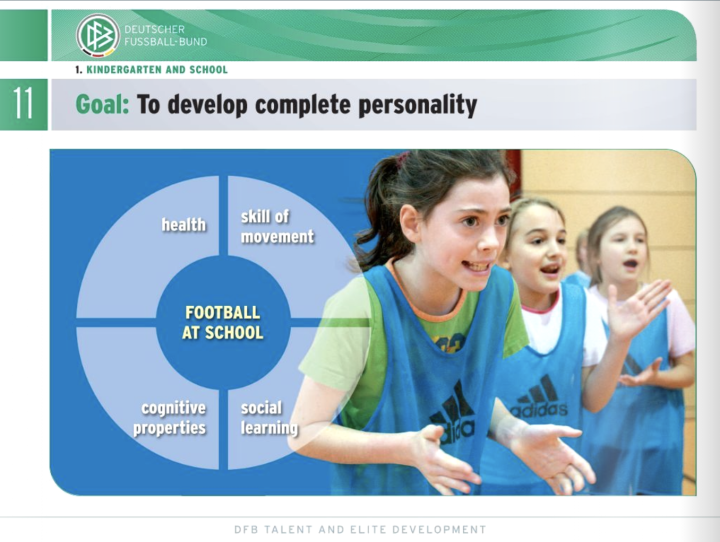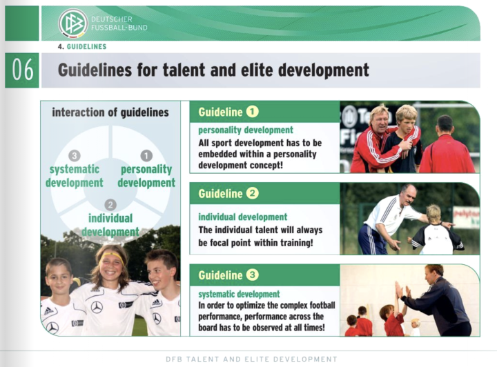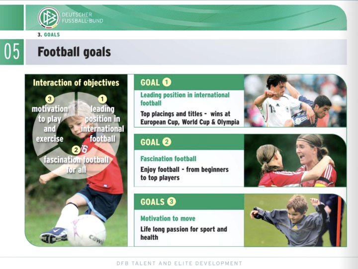 整体上看,德国青训系统有三个愿景。一,走在世界足球发展前列,获得欧洲杯、世界杯、和奥运会冠军。二,让足球成为一项有吸引力的兴趣/娱乐活动,无论是对顶尖人才还是懵懂初学者。三,让每一名踢球者有动力去“动起来”,收获对运动和健康的终生追求。