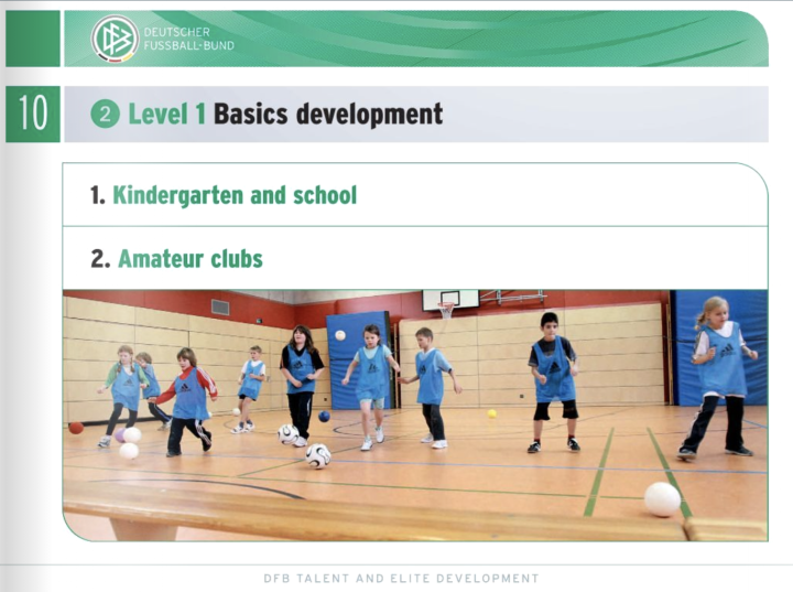 因材施教的德国足协制定了三个关注点:获得锻炼机会,初步了解足球,感受足球快乐。足球可以让小朋友的跑步、跳跃、平衡能力得到提升。在体育馆中有意思并简单的带球传球训练和比赛可以帮助小朋友认识足球这项运动。