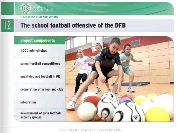 为了达成这些目标,德国足协计划建造1000块迷你足球场,组织学校内部足球比赛,在体育课中教授足球,为学校与足球俱乐部的合作穿针引线,以及不忘发展女生足球队伍。