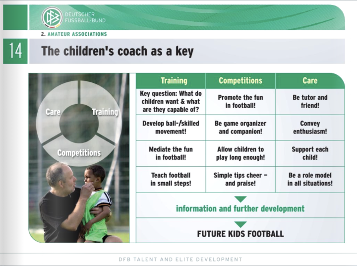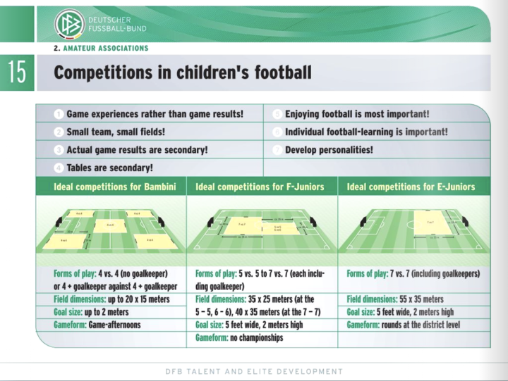 德国足协还特别指出了这个年龄段的比赛中需要注意的方面。小球员的比赛过程一定比比赛结果更重要。任何足球数据(控球率、射门次数...)也只是数字,并不能代表什么。小场地与人数合适的队伍可以保证最好的足球体验。