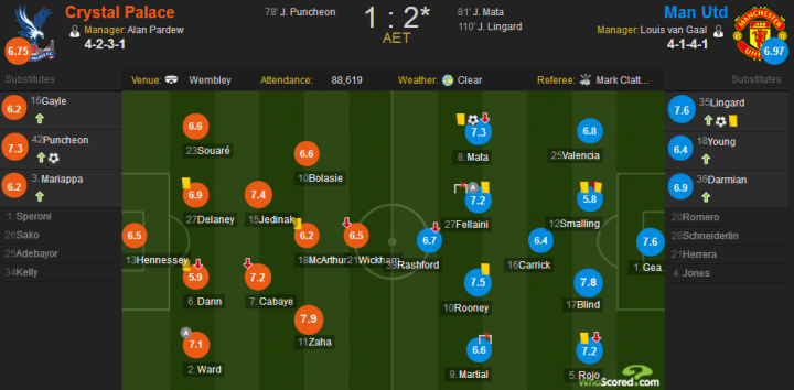 加时赛第7分钟,鲁尼左路拿球内切,禁区弧顶前弧线球攻门找球门右上角,可惜球打高了。加时第12分钟,水晶宫中场长传球到禁区内,布林德头球解围,博拉西耶跟进一脚凌空抽射,球被德赫亚单掌化解。