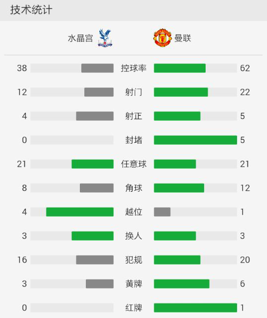 第15分钟,鲁尼禁区前拿球尝试一脚远射,球蹭在防守队员身上发生变线被亨内西侧扑得到。第19分钟,水晶宫获得左路任意球,卡巴耶传球到禁区内,博拉西耶前点头球后蹭,德赫亚单拳将球击出横梁。