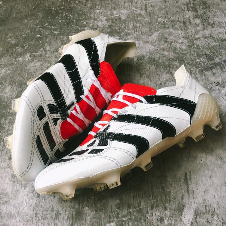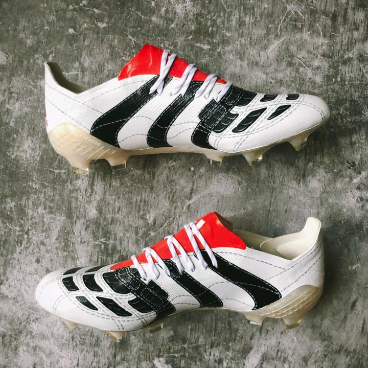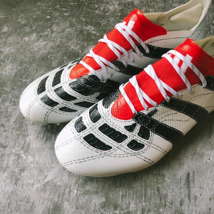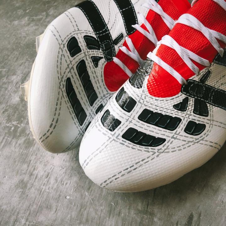 这双为拉云打造的定制涂鸦战靴基于阿迪达斯速度型战靴X GHOSTED.1打造,灵感则是源自于经典的“白/黑/红”配色adidas Predator Accelerator足球鞋。虽然此前阿迪达斯多次复刻过该系列战靴,但这一深受玩家们喜爱的配色却始终未能复刻。无论是拉云上脚照,还是Pete郑发布的球鞋成品图,这双定制涂鸦战靴在外观上与那双Predator Accelerator足球鞋真的做到了“神似”,并且鞋面上手绘的立体橡胶鳍状摩擦块还带有立体效果,看起来如同真的带有摩擦条一般。