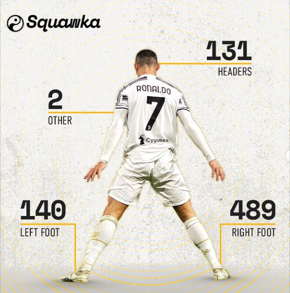 在C罗36岁生日之际,著名数据网站Squawka统计了C罗至今生涯762球的进球部位统计: