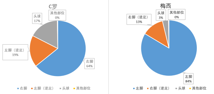 那么,C罗和梅西的生涯总进球里,顺足、逆足、头球分别进了多少个、占比多少呢?