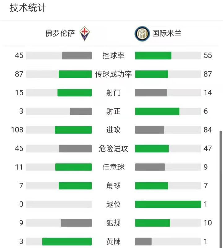 1, 两队比赛技术数据统计:国米控球率,射正次数都相较佛罗伦萨占优,详细数据见图。