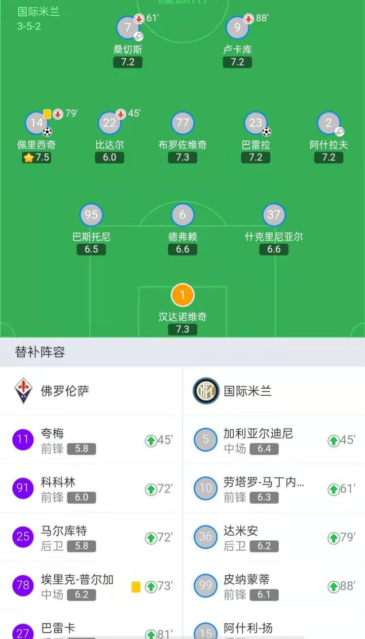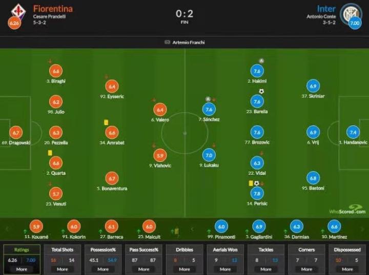 孔蒂虽停赛但干的不错,佛罗伦萨vs国米赛后球员评分及点评
