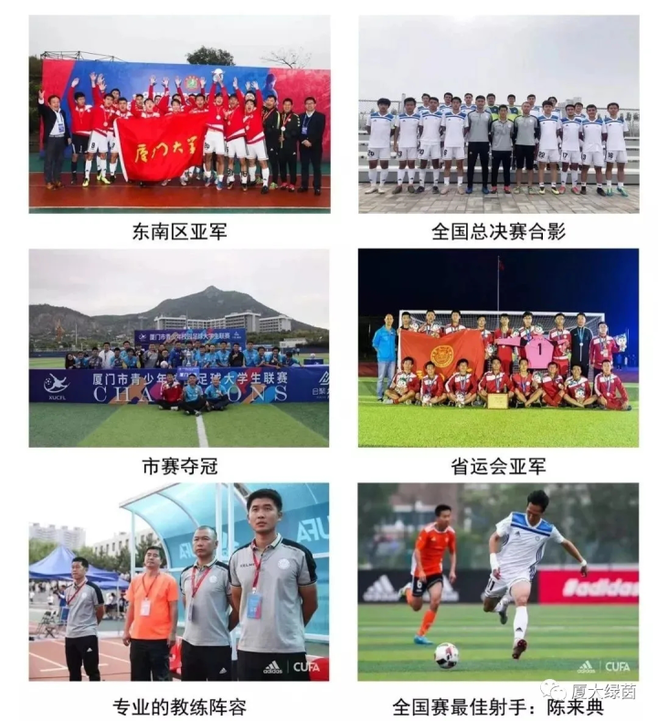 比赛成绩 : 2020年厦门市青少年校园足球大学生联赛冠军;2019年厦门市青少年校园足球大学生联赛季军;2018-2019赛季“阿迪达斯”大学生足球联赛全国赛第五名;2018-2019赛季“阿迪达斯”大学生足球联赛东南区亚军;2018年福建省省运会大学男子甲组亚军;2018年厦门市大学生足球联赛冠军;