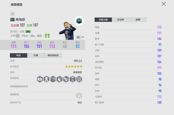 很遗憾,今年内马尔没能入选21TOTY,但20TS的银卡非常值得推荐。从卡面上来看,双速都是110+,灵活和盘带高达116+,要知道,在2月份的版本更新中,盘带的能力值也有助于提升球员的带球速度,所以这张卡超高的盘带和速度一定能助你在绿茵场上超越对手,洞穿球门!