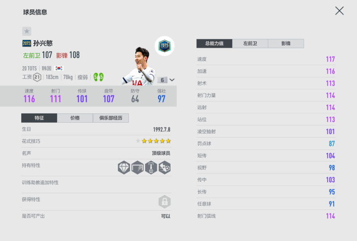 为什么推荐这张卡呢?因为他性价比高啊!1500亿左右的价格,双速116+,并且还有不俗的射术和盘带,虽然搓射的风光不再,但在当前版本下,依靠孙兴慜的速度下底倒三角还是非常好用,即便遇到传球线路被封死,双5脚的他还能自己创造进球~